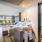 I de öppna badrummen finns bekvämligheter som hårtorkar och badrockar. Några av rummen har utsikt över havet.
